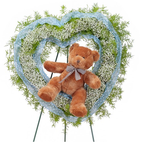 A heart of sweet white babyâs breath surrounded by blue ribbon with a plush bear seated inside is a perfect tribute for a tiny angel.