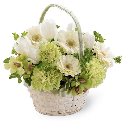 This pretty white basket holds white tulips, pistachio carnations, white mini Gerbera daisies and a single green cymbidium orchid. Your little Flower Girl will be thrilled to carry her basket down the aisle.