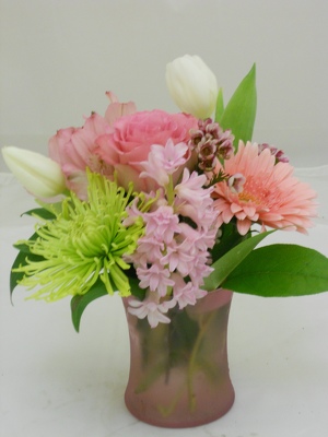 Assorted dutch flowers with tulips, alstro and fillers in pretty a colored vase.